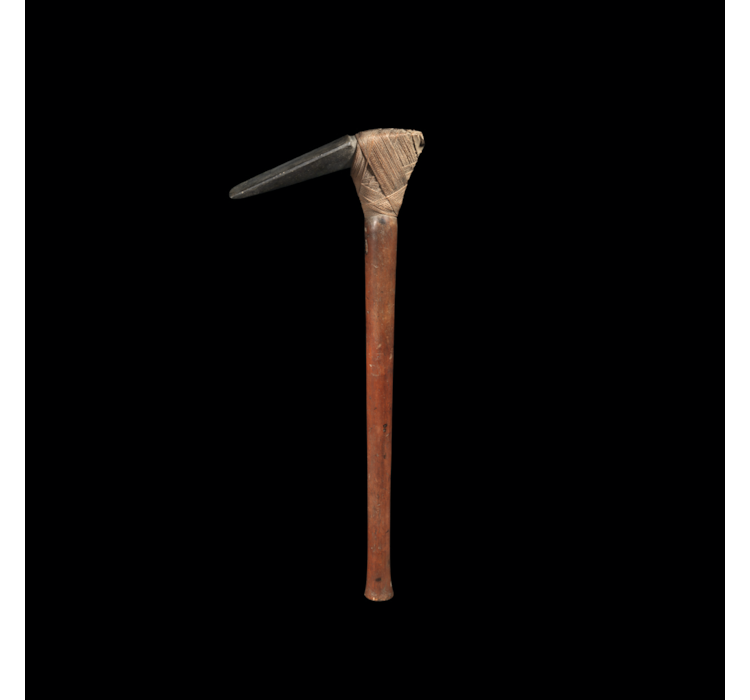 A master-carver’s wood working adze mounted with a long, tanged, triangular blade. The elegance and dimensions of the blade as well as its remarkable state of preservation show that this was a tool of the utmost importance. It is reported that artists would put their favorite adze “to sleep” in the temple on the night before beginning an important sculpture so that the adze would benefit from the powers instilled by the gods. The shaft is superbly rendered with a complex cross section ranging from the flared, perfectly circular pommel to oval and on to a sharp-ended egg shape towards the heel of the adze. The binding is made of sennit (braided coconut husk) tightly wrapping the tanged blade to its carved-out lodging and buffered with a section of shark or stingray skin.