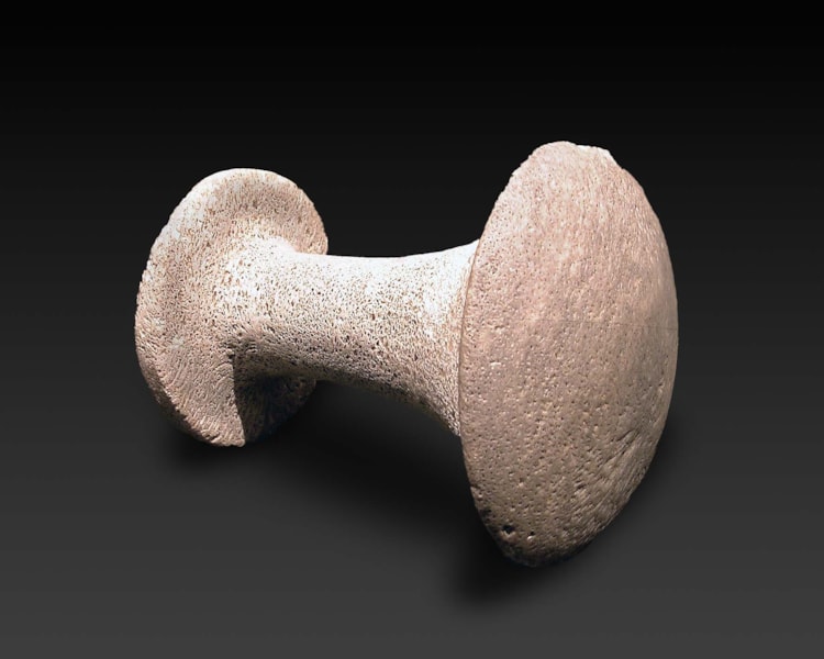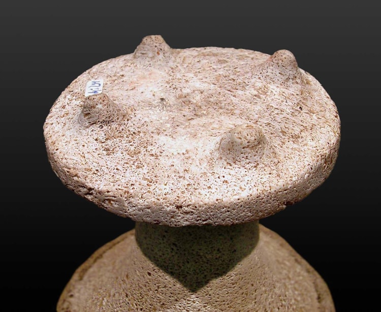 An extremely fine food pounder, or phou, powerfully carved of a single piece of massive and dense coral rock. The flattened, circular top of the pounder is decorated with four large, raised, equally spaced, pointed, nipples. These precious objects were used to pound breadfruit and taro into a form of pudding or mash which was the staple vegetal food of the micronesian islanders. Carved of prehistoric coral rock, as there were no lithic depositis on the atolls, these pounders were important wealth items and social identifiers. The extremely weathered patina is from exposure to wind-swept sand. These heir-loom pounders were often buried with their female owners and have surfaced, over time through the erosion of the tombs at the seaward gravesite of the atoll. The balance and perfection of form and surface are exceptional here.