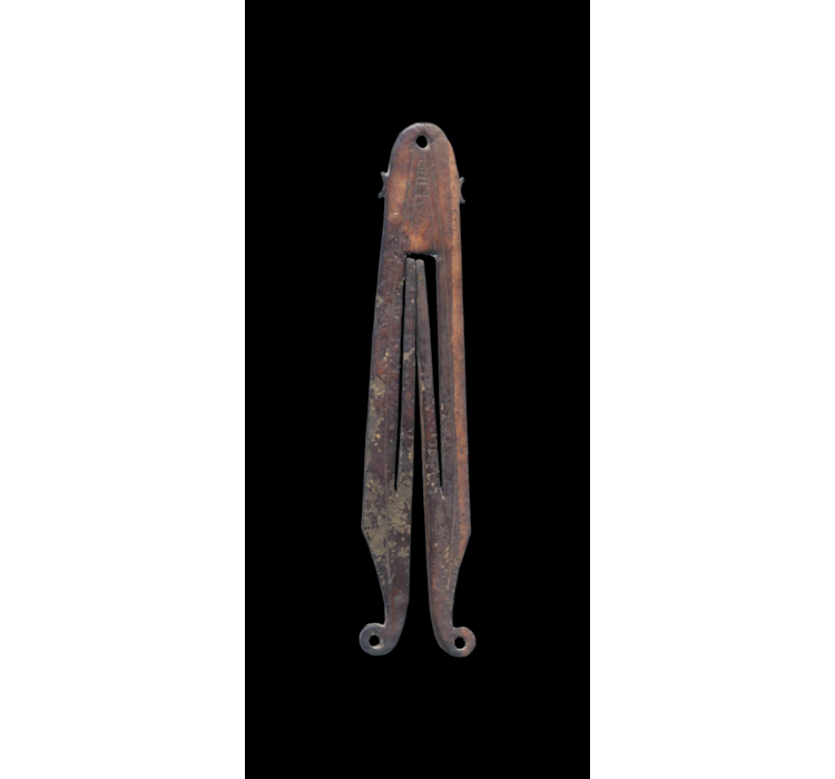 E 295) A rare archaic thimble holder with incised decor to both sides. The general shape appears to be that of some form of stylized marine mammal a small whale or a seal. The body of the animal is indicated by the incised lines covering the flat sides of the hook and the protruding lateral flippers. There are three basic formats for thimble holders : double hook, single hook, and double yoke. In this case it is a double hook form with a rounded terminal section pierced for attachment to the sewing-kit hook. Skin thimbles were made from tanned and shaved seal skin with an attached loop or sometimes tip-less so that they could be hooked on to the holder for storage and carriage. Punuk culture, Alaska. Mineralized walrus tusk (Odobenus rosmarus divergens). Circa 600-1000 AD. 11,3 x 0,2 cm.