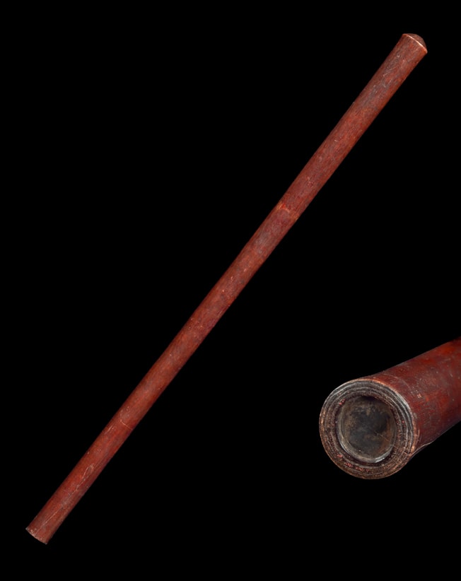An exceptionally large and massive bowai (or more properly pronounced "mbowai") a pole-club of unusual length and weight. The club is completly smooth and perfectly cylidrical from one end to the other. The only decoration is the deeply recessed butt with the rim decorated with three concentric engraved rings. Fiji, Western Polynesia. Casuarina Equisetifolia. 126 x 6 cm. 19th century.