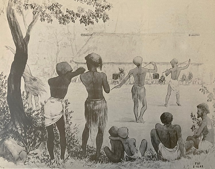 See here the drawing by Arthur John Lewis Gordon, cousin to Fiji's governor, Sir Arthur Gordon showing a game of Tiqa, the reed-throwing competition which often led to fighting and conflict bewteen villages.