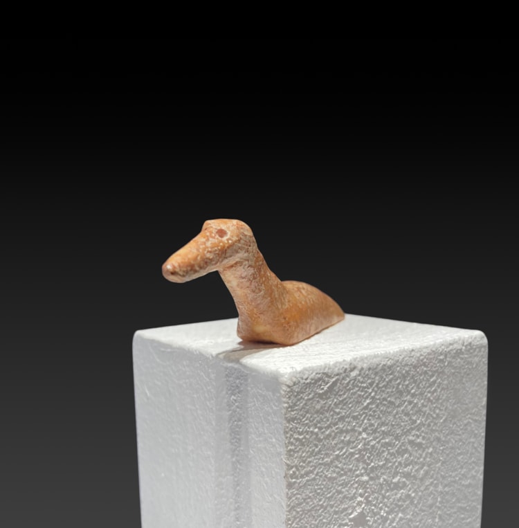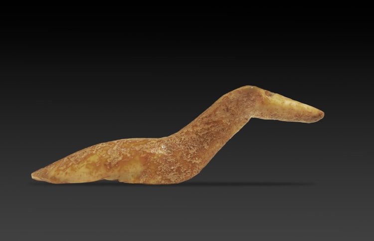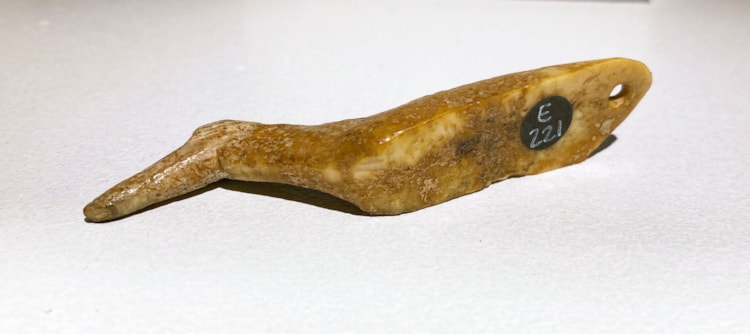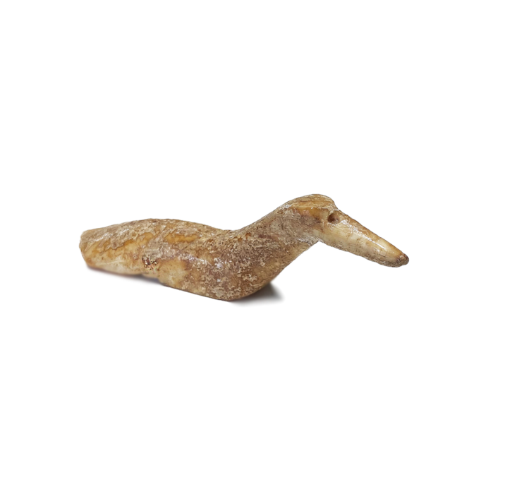 E 221) A very large and naturalistic gaming piece which can be used as marker or counting tally. It is remarkably well carved in a sensitive manner with its head extended in search of prey. These markers are often carved in a generic format although some are sufficiently representative that the species can be readily identified as with this example, which represents a loon (Gavia arctica) recognizable with the long pointed beak, the head thrust forward and the twin feather tufts above and behind the eyes. The loon is often associated with shamanic practices through its distinctive call and inquisitive nature.