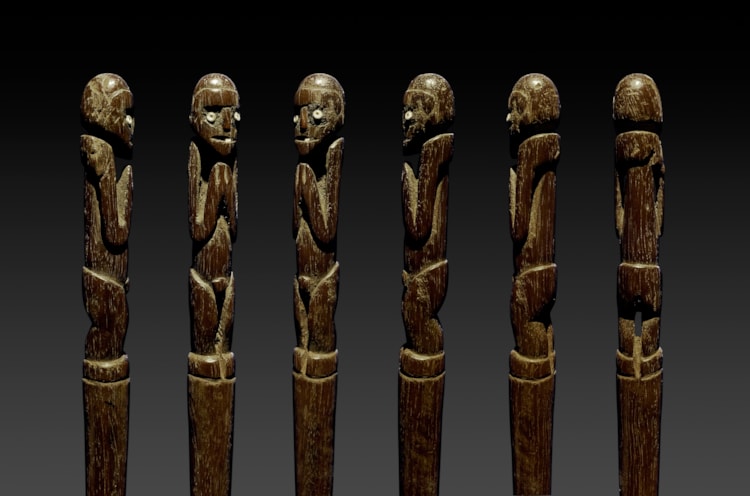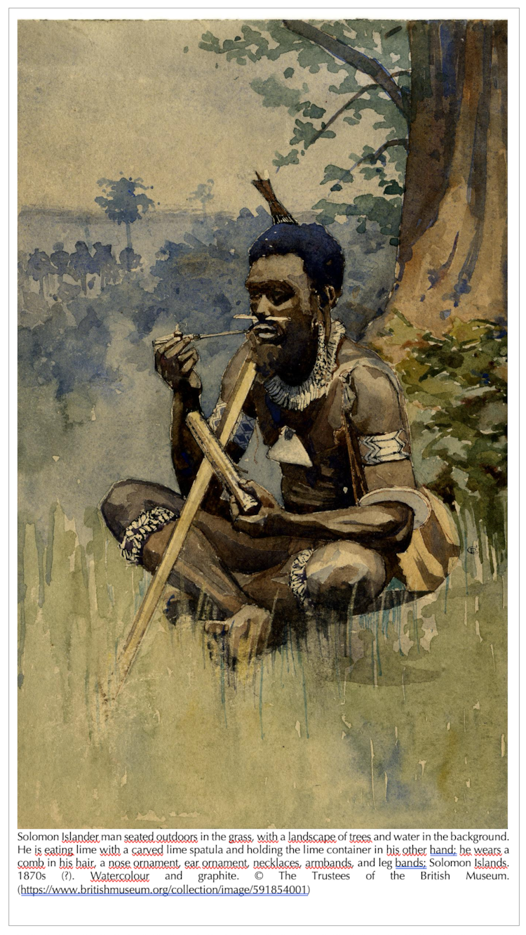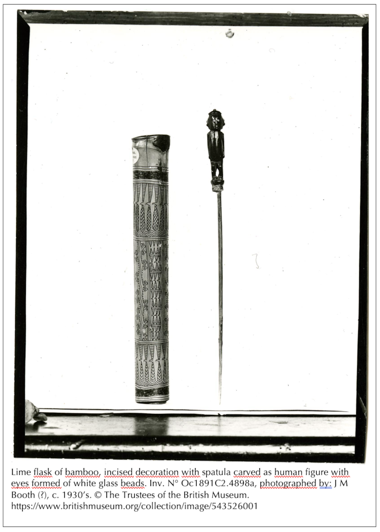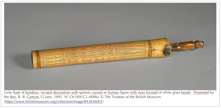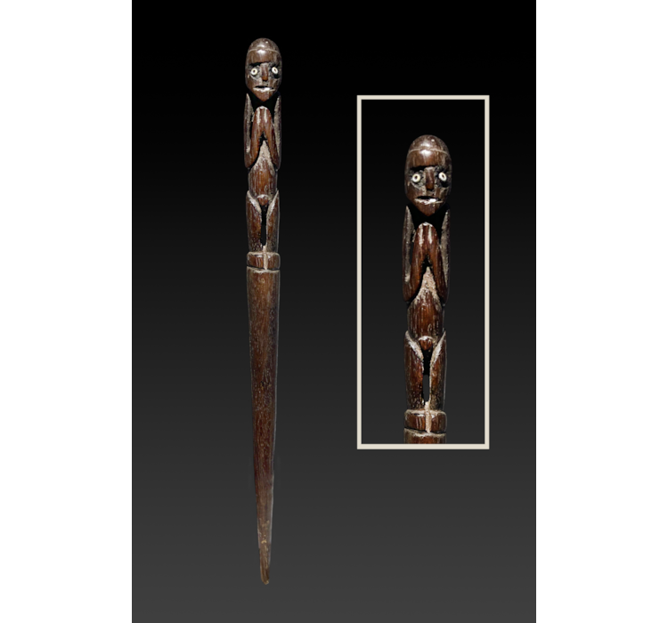 An extremely rare lime stick representing a standing ancestor figure holding his hands to his chin. The figure is carved in full 3-D and powerfully rendered. Figurative lime-sticks are excessively rare in the corpus of Solomon art. Perhaps they were the exclusive property of high ranking chiefs or priests.