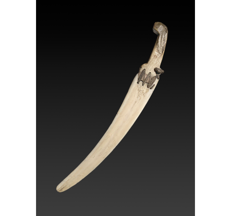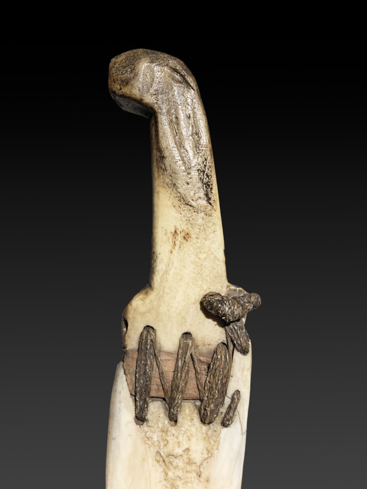 Iglulik people, Nunavut, Northern Canada. Thule period c. 1700/1900 AD. Walrus bone, tusk and sinew with a fine patina of age and use. 45 x 5,5 x 1,5 cm.