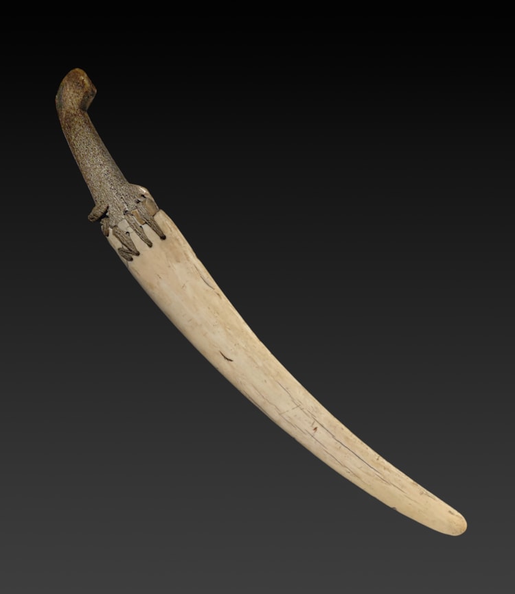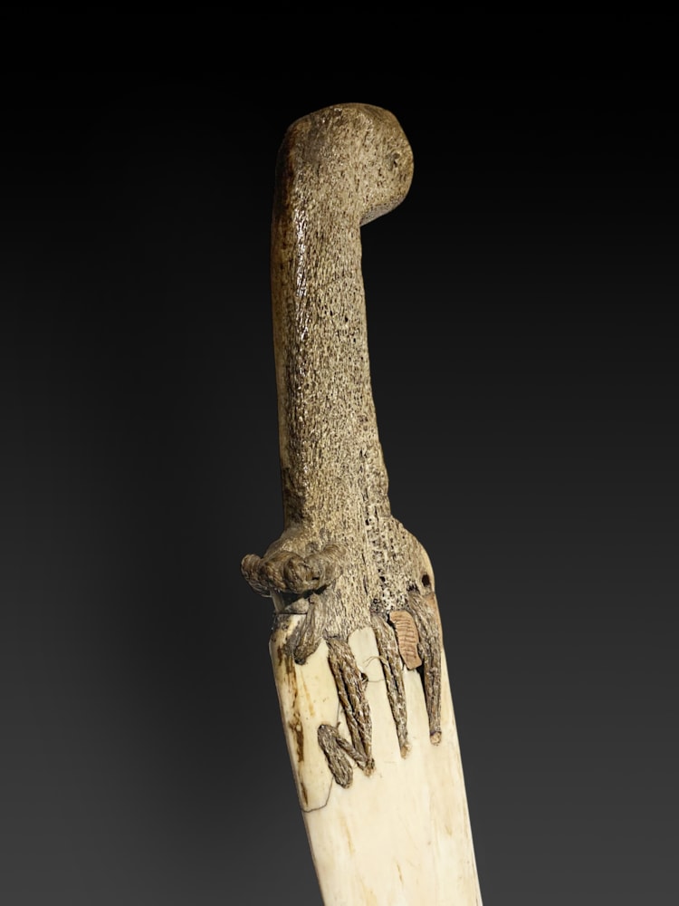 E 385) A fine and well used snow knife in the form of a curved cutlass. The composite knife is composed of two distinct sections which are the permanent handle and the replaceable blade. In this case the handle made of walrus bone is very ancient and well-worn through decades of usage whereas the blade is of later manufacture although showing signs of wear and usage. The remarkably perfect blade is cut from a central slice of a medium sized walrus tusk and is tightly lashed to the handle with sinew bindings and reinforced with small, wood wedges. The distal end of the blade is notched to match and fit with the notching’s on the handle reinforcing the attachment. The sinew attachment loop for portage is still present on the handle.