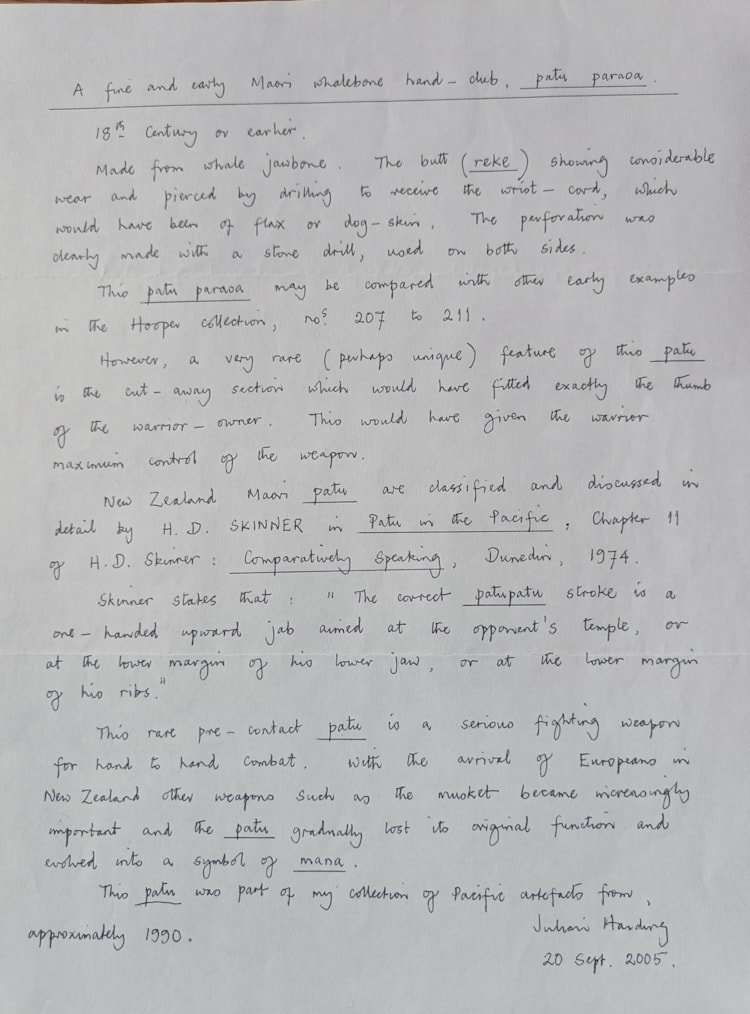 Literature: Julian Harding in his descriptive letter of 2005 offers that the missing section of this patu was specifically created to accomodate the users thumb when grasping the weapon for combat. I beg to differ and propose that the missing section has specific caracteristics that can be related to a blunt force trauma such as a lead bullet from a musket. Weapons are often damaged in combat and this could be one example of what can happen on the battlefield to such a prestigious weapon. It is of course pure conjecture, but one can surmise that perhaps the Patu deflected a bullet, saving the Maori warrior from injury and thus acquiring powerful mana for both it's owner and the Patu.