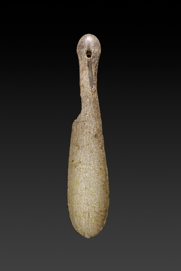 Whale bonne (physeter catodon) with a very early and worn patina. 36 x 7,5 cm. 17/18th century, pre-contact from the Te Puawaitanga period, 1500-1800.