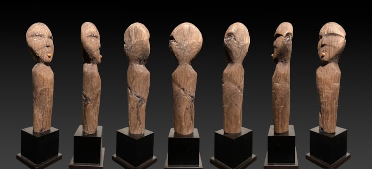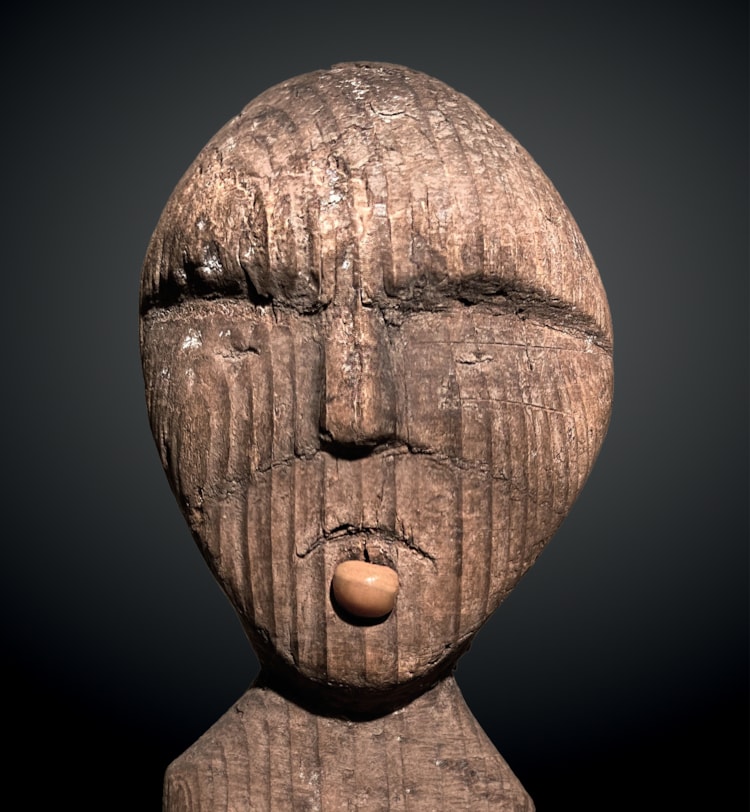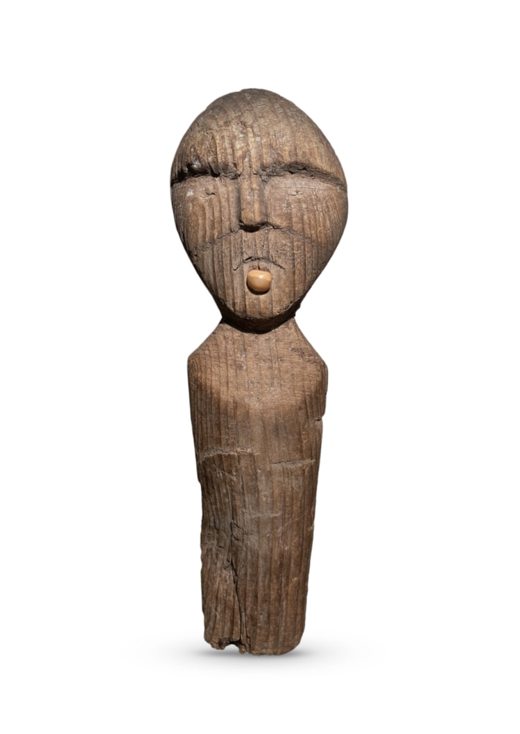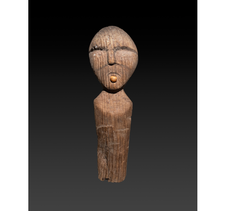 Literature: For comparative examples see the Nunalleq Project which is an international partnership between the Yup’ik village of Quinhagak, Alaska, and archaeologists based at the University of Aberdeen in Scotland. It was initiated by the Quinhagak community to address two locally identified needs; to recover as much as possible from a rapidly eroding archaeological site and to reconnect young people to Yup’ik traditional culture. Over the past 15 years, the Nunalleq Project has contributed ground-breaking new information to our collective knowledge of pre-contact (i.e. pre-colonisation) Yup’ik culture, excavating the remains of large multi-room house dating between c AD 1570-1675. As of 2024, Nunalleq has produced the most extensive collection of pre-contact Yup'ik material culture in the world with over 100,000 artefacts. In 2018 a local, community operated museum opened in Quinhagak – where the Nunalleq Collection is on public view. Almost 500 examples of wood figures such the one offered here have been found in the various strata of the excavation, notably N° GDN-248:78012 and GDN-248:76791 which are of very similar style.