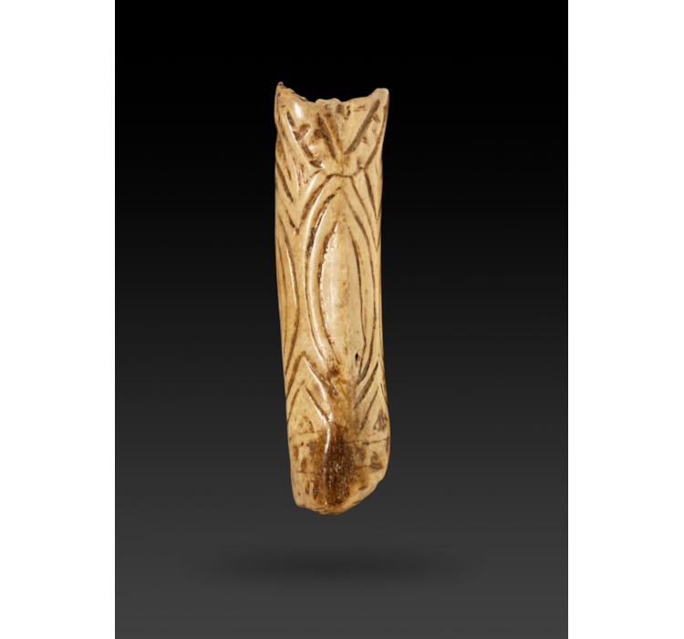 A very fine and archaic bone magical tube carved overall with stylized representations of the ancestral spirits or Nggwalndu. Long thought to worn in the hair these remarkable and esoteric objects are now known to be used in making magic – the type of magic however is still yet to be disclosed. Michal Hamson reports in his Abelam catalogue of 2015 (p. 241) that the tubes and their function were « each time … explained in terms of magic and secrecy with the suggestion of malicious intent »… by his informants in the field. In some cases old traces of compounded lime are found on the well worn, porus surface in the inside of the tube, however this presence of lime is still unexplained as well.