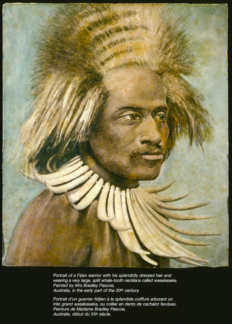 A large and powerfully carved kali headrest. The thick circular center section is a well-known form. It is extremely elegant and structurally sound. Carved with stone tools from a bloc of iron wood which is used for making the great war-clubs, this headrest was surely the property of an important man. The embellishment with inlayed white glass trade-beads shows not only wealth but can be related to the fine white bead encrusted necklaces worn by high-ranking warriors. The beautifully flared neck-bar is completely notched along one side and partially on the other. The completely notched side is unusual in that the 101 small cuts are divided into nine equal sections and one with eleven marks. While notching on war-clubs can be considered to be a form of a victims tally the notching on headrests is not yet defined. It may possibly be a record of the number of people that the owner has eaten as cannibalism was a norm in Fiji whereas elsewhere it is purely ritual. There are several recorded instances of Fijian men keeping tallies of how many bodies they have consumed over their own lifetime and where better to keep note than on your own prestigious headrest. One long edge of the base is deeply notched to the point that it appears as if chopped and the other edge is partially shaved as if to remove some notches.