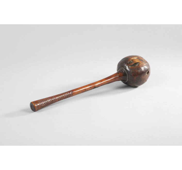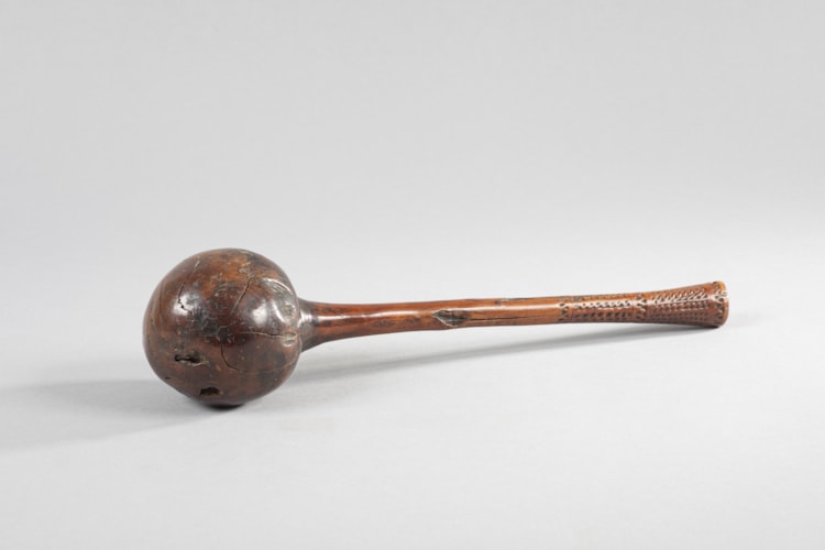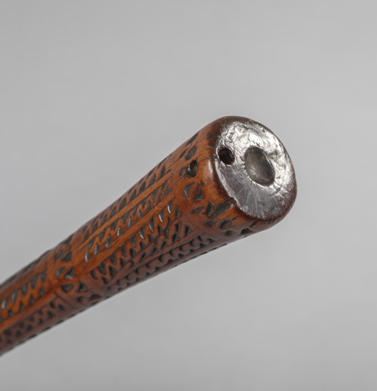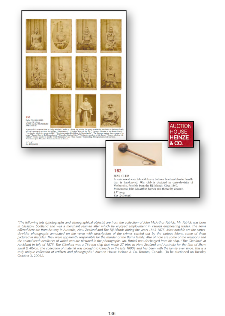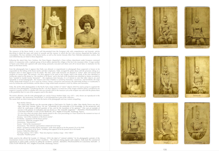 The Burns family massacre took place in 1873 following on the heels of a previous terrible misunderstanding in which two European settlers were killed by men of the Kai Colo Mountain tribes, along the Ba River on the island of Viti Levu. These horrific events stemmed from disputes about land ownership and the aggressive advance of European settlers creating homesteads far out from the established townships. This club is photographed twice by Francis Herbert Dufty II (c. 1846–1910) in the hands of the Burns massacre suspects.