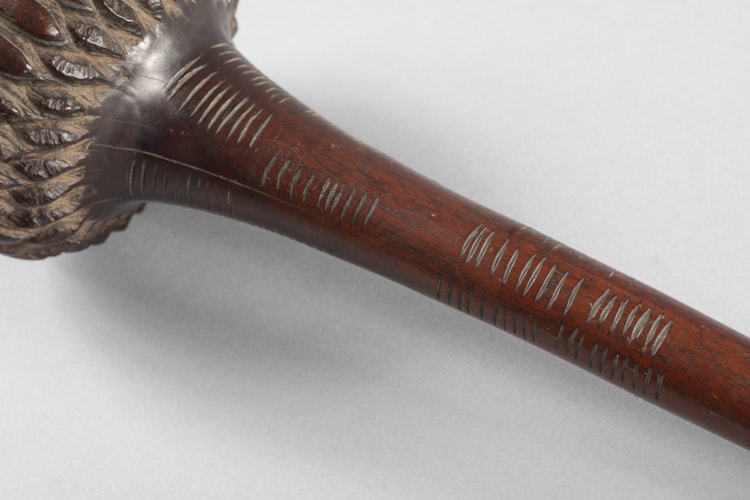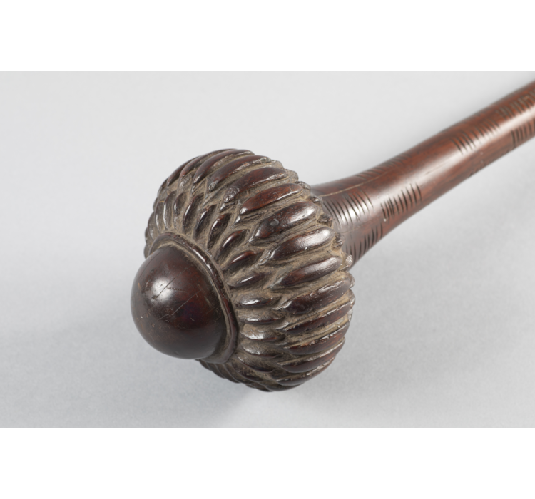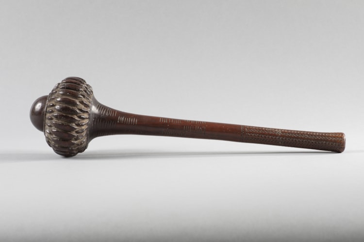A throwing-club, or I ULA TAVATAVA, with 186 kill marks on the shaft. The death tally is grouped in eighteen sections of 10 each and one of 6. The dome-tipped head is segmented into 28 large lobes edged with a ring of smaller studs to both sides. The grip is incised with fine geometric motifs thought to represent the stylized woven motifs of fiber mats, and the butt is recessed.