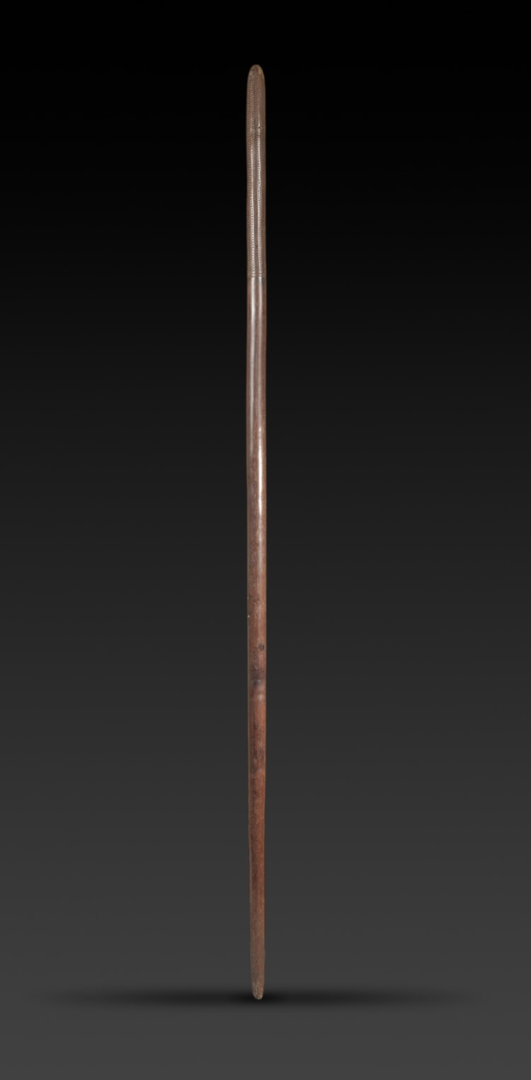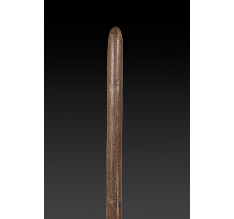 A very long and simple pole-club, possibly an enlarged Bowai (Povai, Gadi). These are said to be chiefly walking sticks used notable by the mountain tribes; however, I have no information to confirm this information. The grip is unusually long and finely carved with the classical zigzag motifs. While reminiscent of the Samoan chiefly orators staff the ornamentation here is definitely of Fijian style.