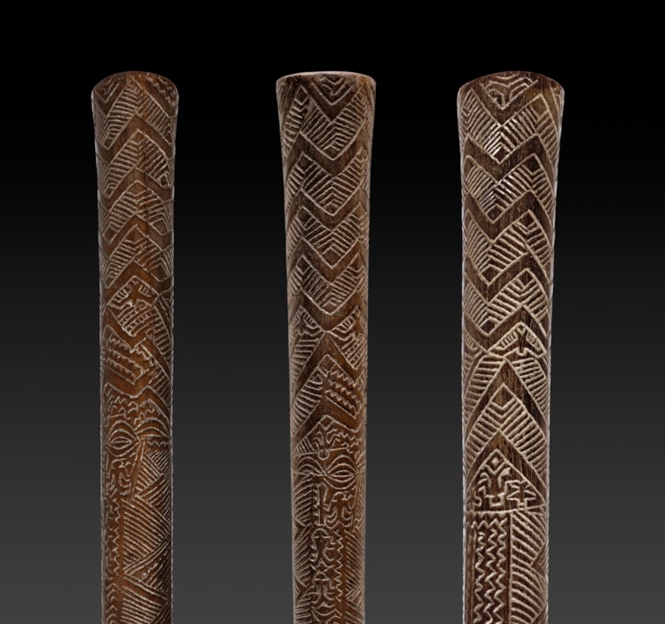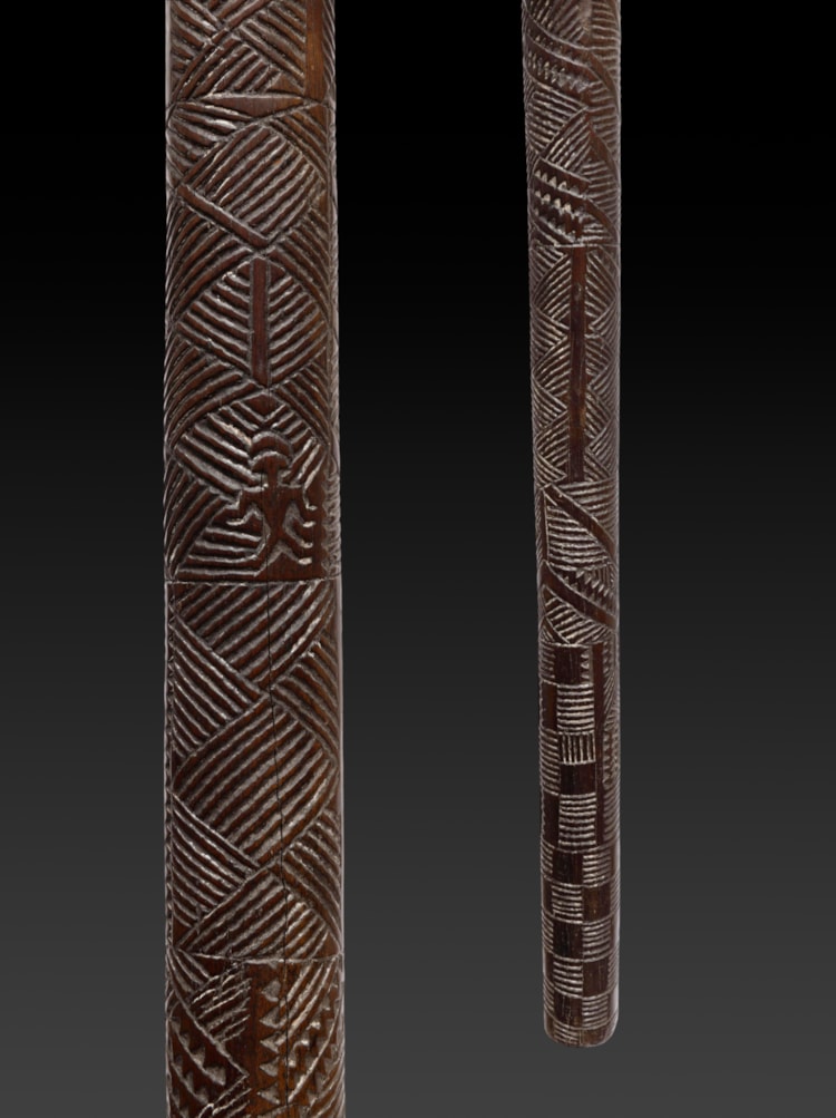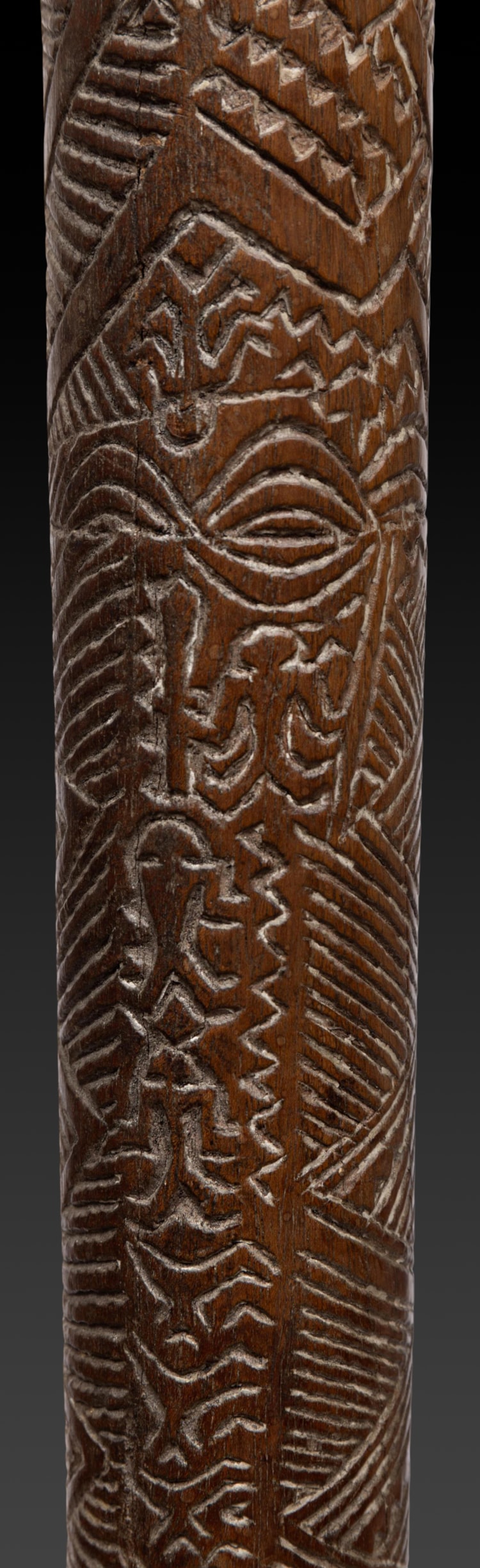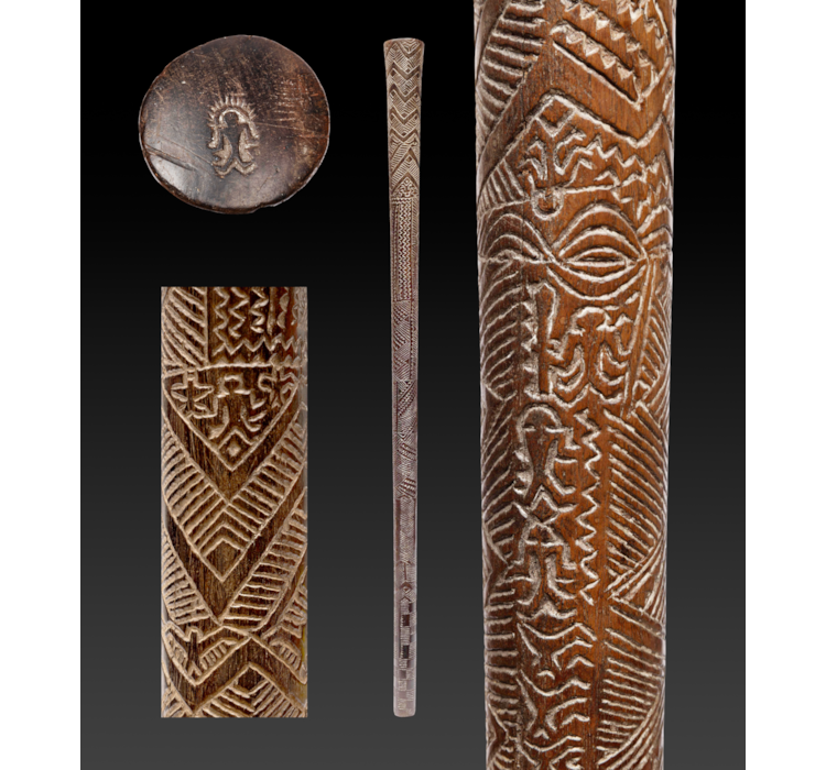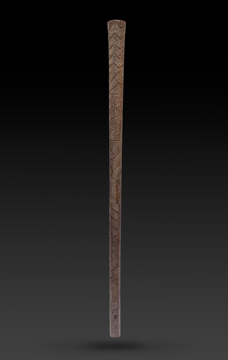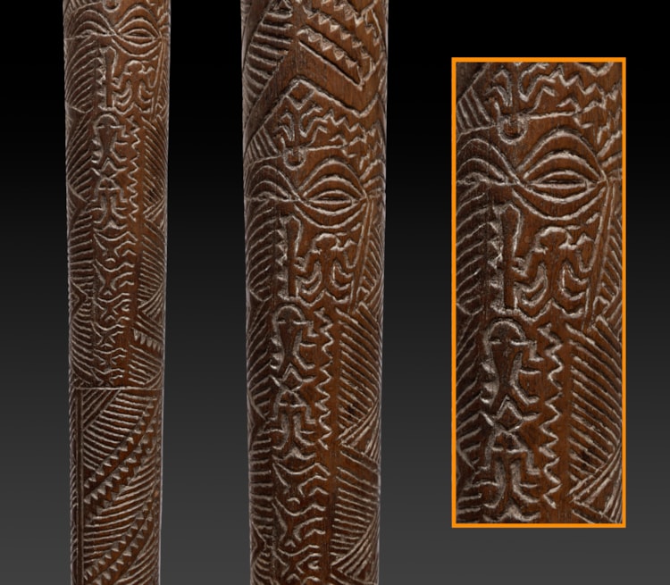 A Bowai or pole club entirely covered with incised designs representing various forms of stylized woven matt motifs, geometric elements, 20 birds, 7 human figures, 3 Rarotongan type eye-motifs and 1 dog.