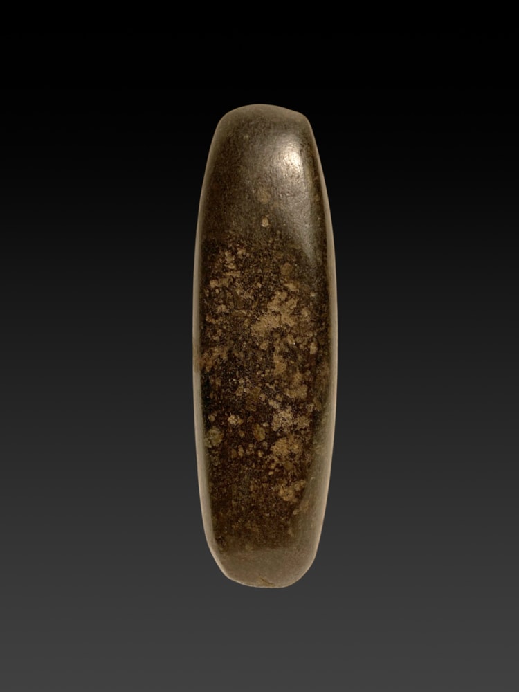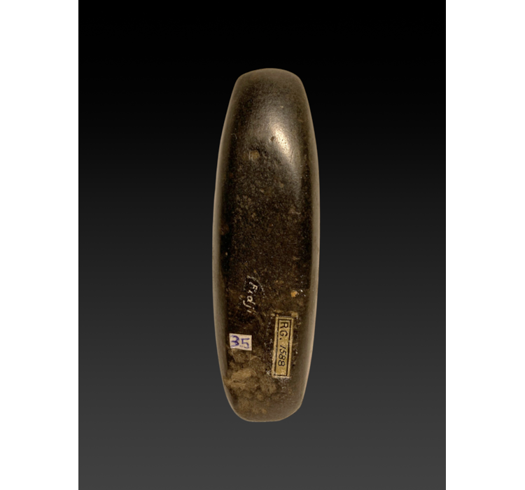A short adze blade of the classical Fijian type consisting of a finely polished basalt blade of squared section tapering narrowly towards each extremitiy. The cutting edge is remarkably small compared to the adzes of other neighboring cultures.
