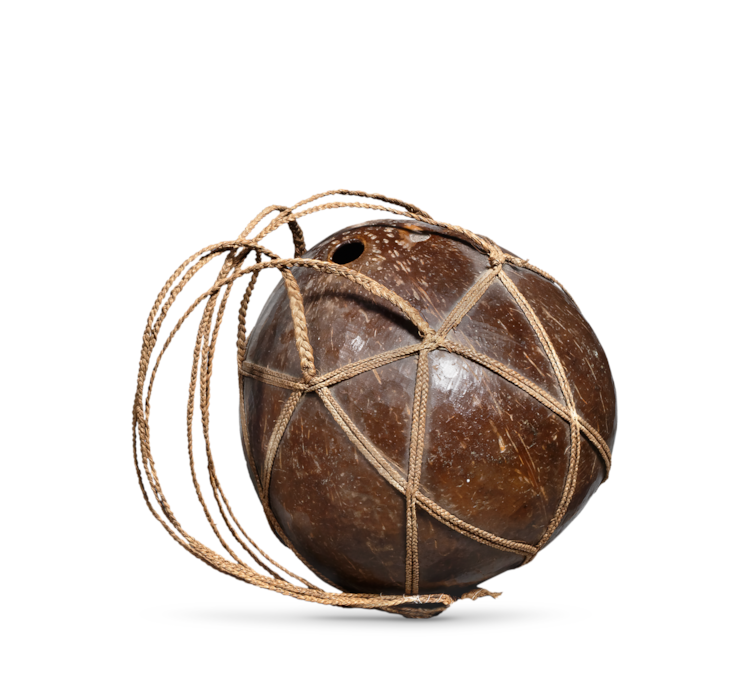 A fine, plain coconut water bottle, or kitu ni somi with the original coconut fiber carrying straps. The rough fibers are stripped from the drying coconut husk and carefully cleaned before being woven together to form a braided rope known as sinnet. This coconut fiber rope can be made to be as fine as sewing thread or as thick as marine hemp hawsers for ocean going canoes. Sinnet is used throughout the Pacific but its is most famous in the Western Polynesian triangle of Fiji, Tonga and Samoa. Here the houses are made with the cross beams and struts roped together with the cord as tight as if held together by nails or screws.
